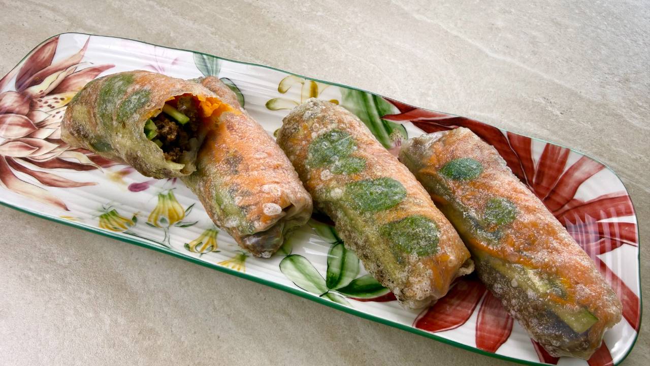Estos rollitos de papel de arroz rellenos de res son una opción fresca y diferente para una cena fácil y rápida. La carne se cocina en minutos con salsa de ostras y soya, y se combina con vegetales crujientes y albahaca fresca para un contraste de sabores y texturas irresistible. Se doran ligeramente por fuera y jugosos por dentro: ideales para salir de la rutina sin complicarse.