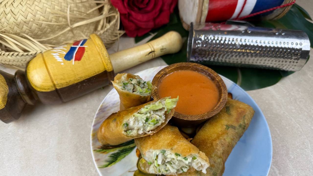 Estos eggrolls de pescado y camarón son un ejemplo delicioso de fusión caribeña, donde ingredientes del mar muy presentes en la cocina dominicana se encuentran con una técnica clásica asiática. El relleno mezcla tilapia y camarones con cilantro, puerro y repollo para lograr una textura jugosa y aromática, mientras la envoltura crujiente aporta ese contraste irresistible. La salsa cremosa de tomate y leche de coco amarra todo el plato con un toque tropical que convierte estos eggrolls en un bocado lleno de sabor y personalidad.