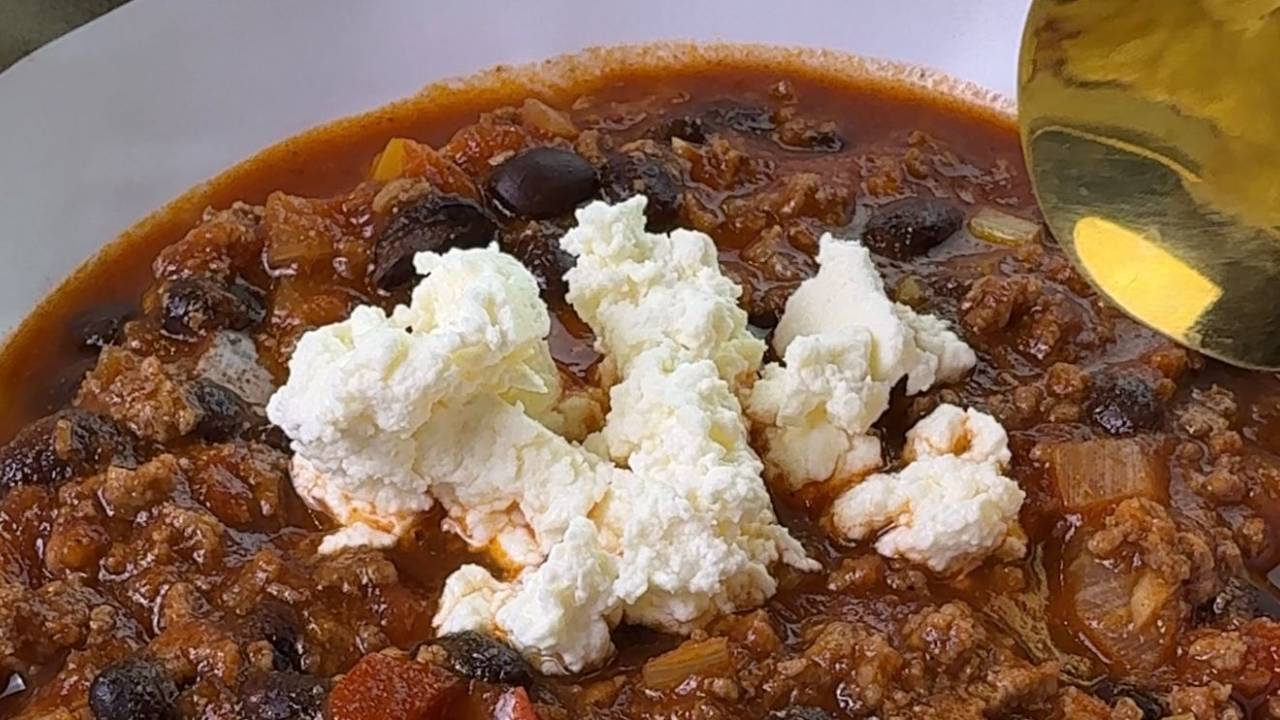 Este chili casero es perfecto para una comida reconfortante: carne molida de res cocida lentamente con especias como comino y chili en polvo, tomate y habichuelas que le aportan cuerpo y sabor. Es un plato que puedes dejar reducir a fuego bajo para lograr una textura más profunda, o preparar rápidamente en menos tiempo. Lo mejor es que se sirve con una cucharada de crema agria y abundante queso cheddar rallado para coronar.